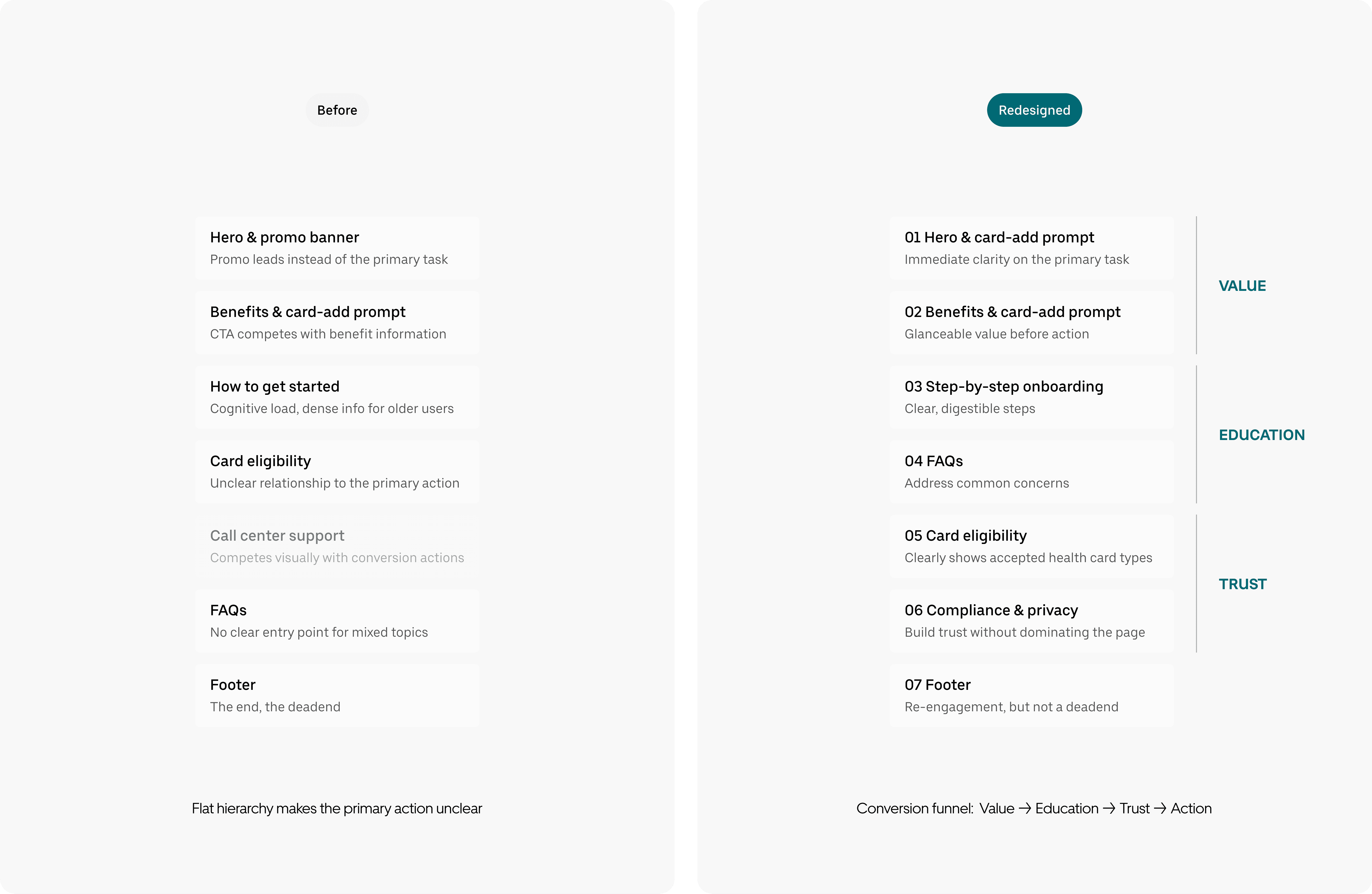I started by auditing the existing page against its stated objective: drive card adds. Working with a content designer, I mapped every content block on the original page and evaluated it against two questions: Does this build trust? Does this move someone closer to adding their card?